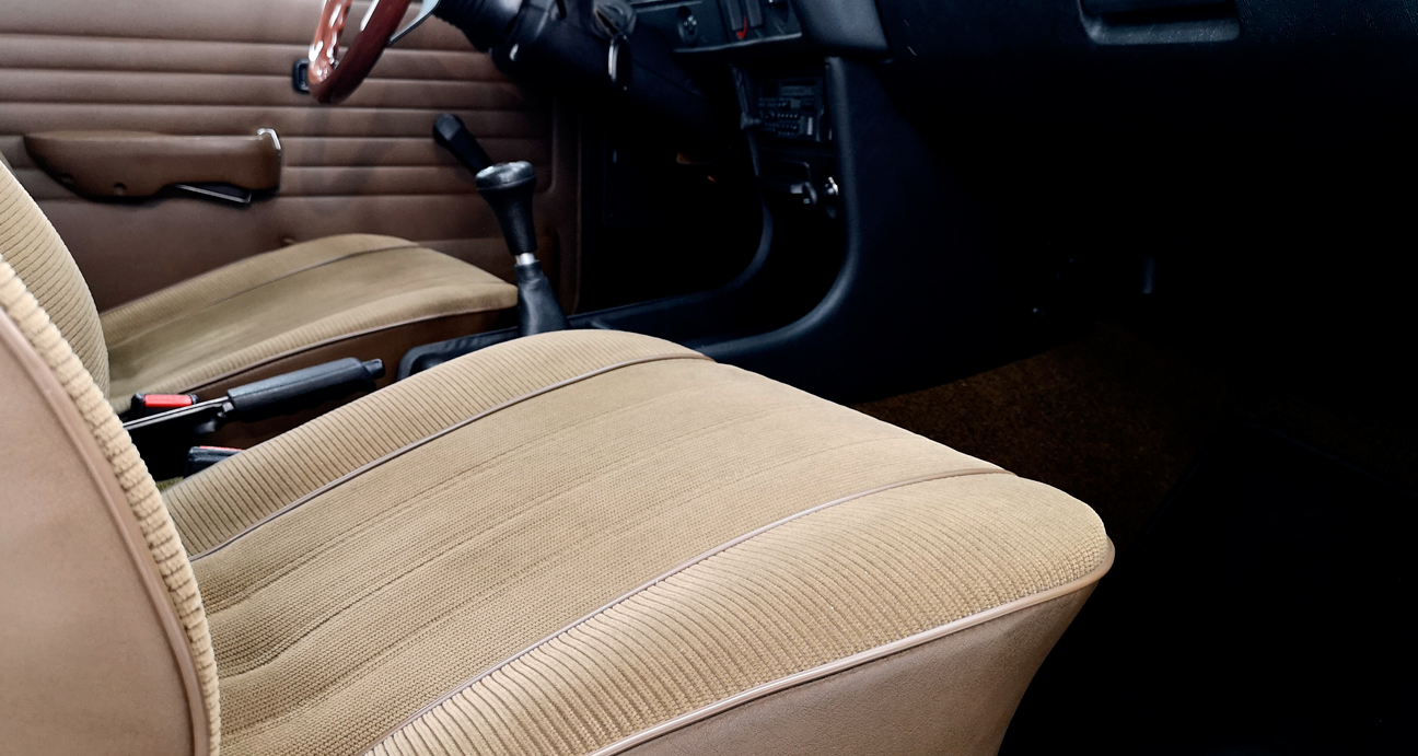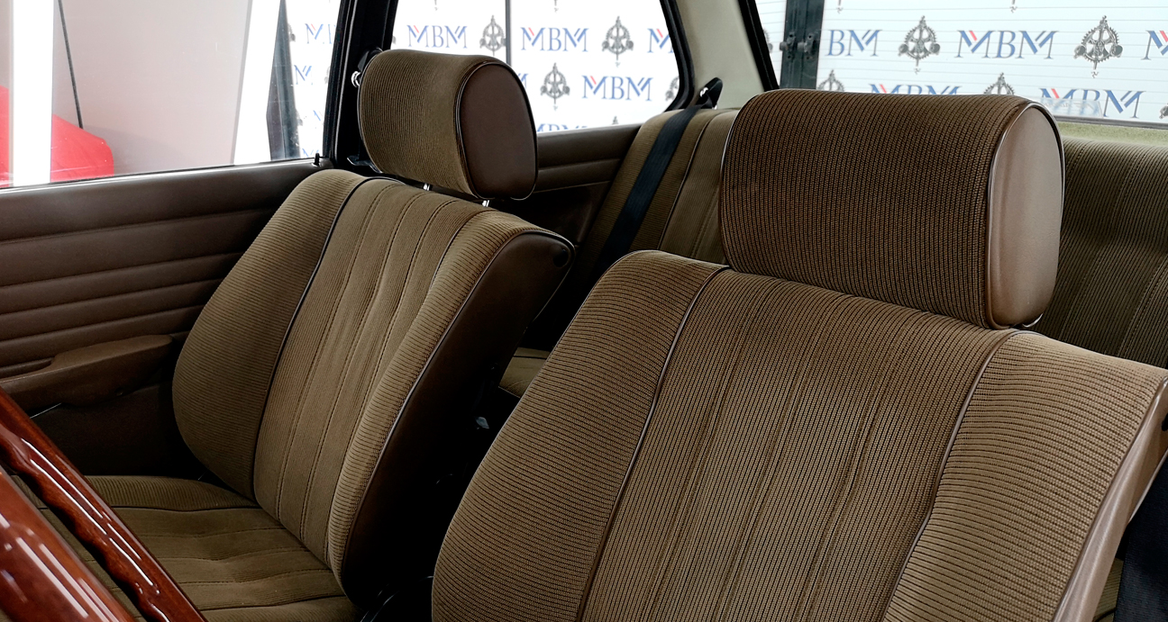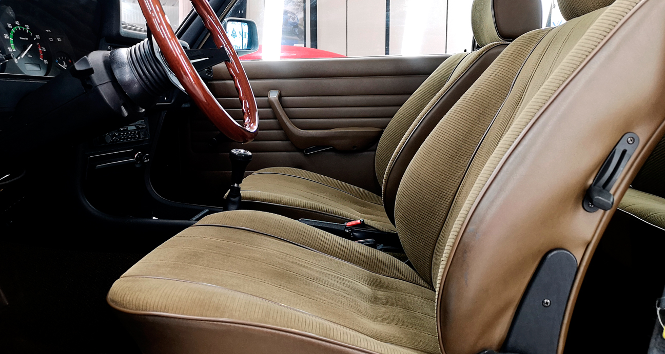 Interior impecable con tapizado moka (0122), sin quemaduras ni roturas. Alfombra, paneles de puertas, techo interior, salpicadero en perfecto estado, todo nuevo y original.