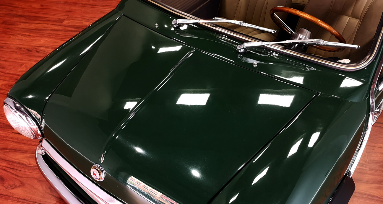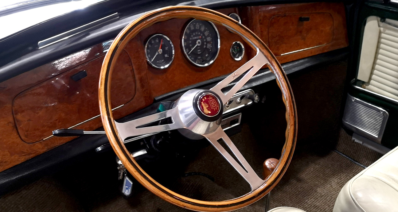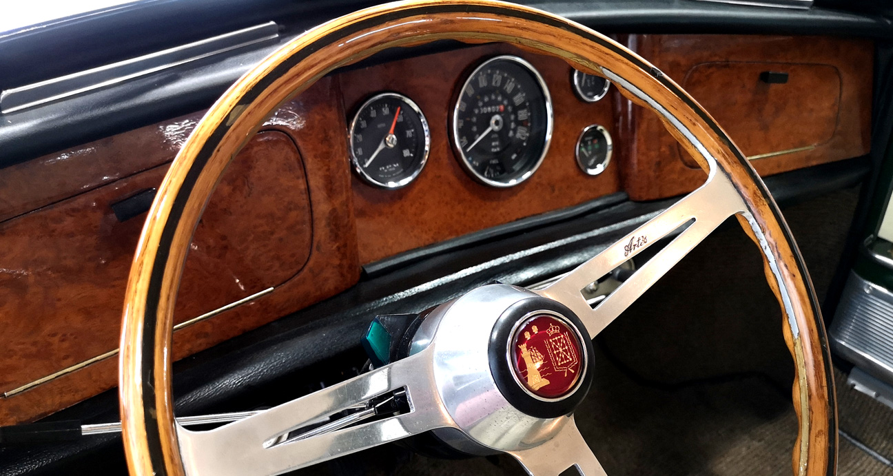 Magnífica combinación de colores, exterior verde con tapizado de cuero beige. Panel de instrumentos de madera, pomo de cambio y volante.
