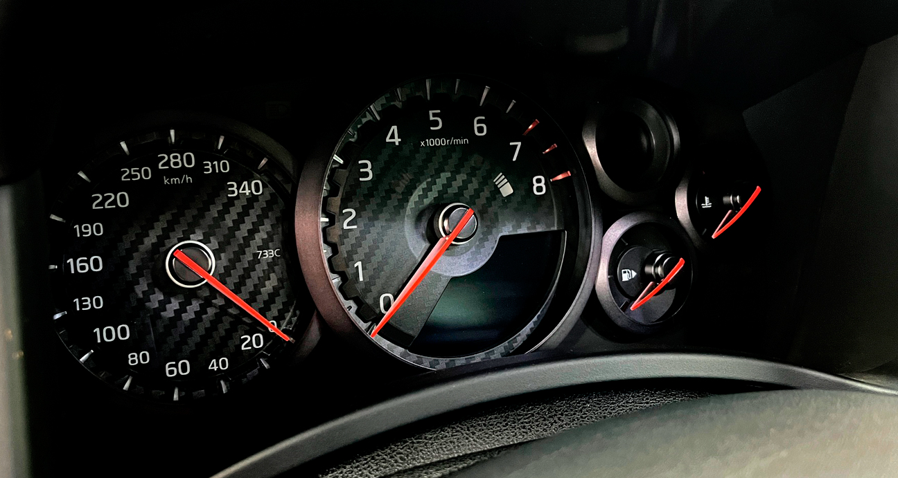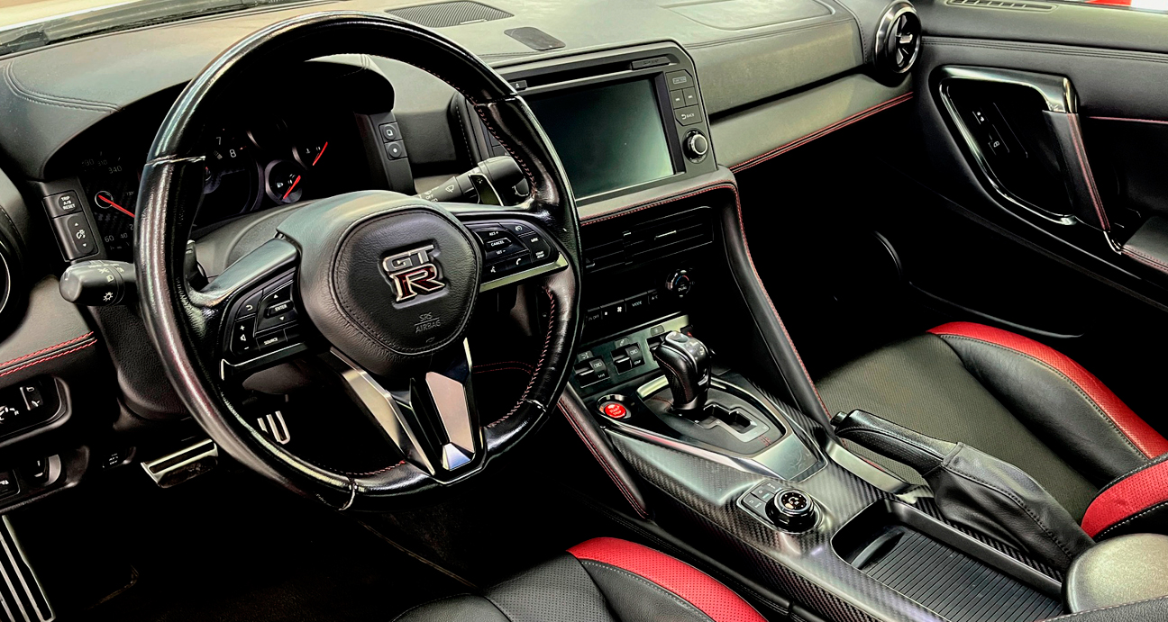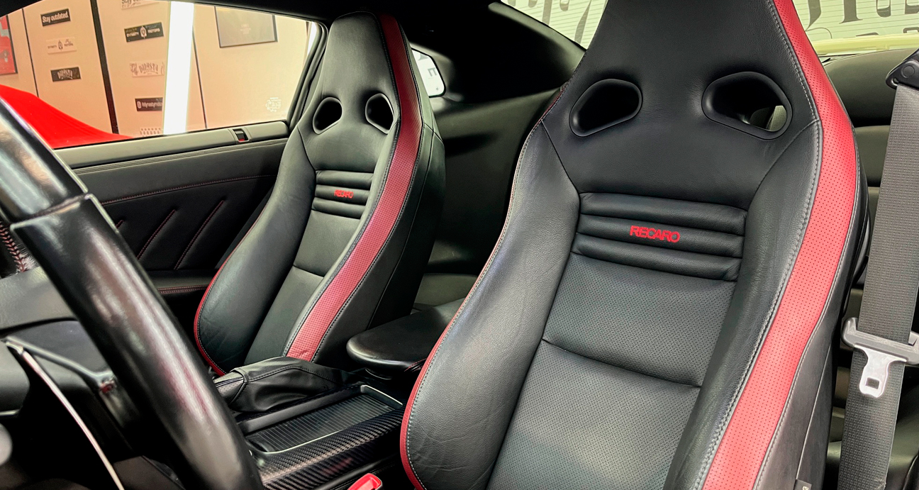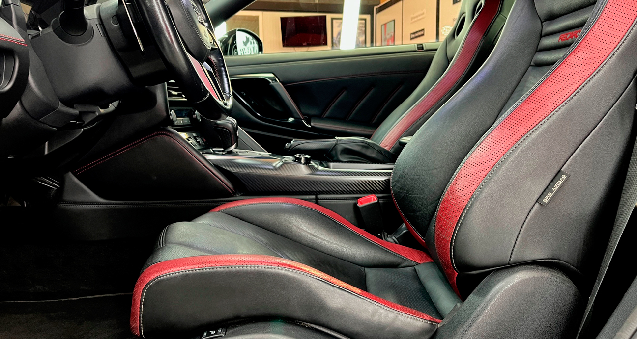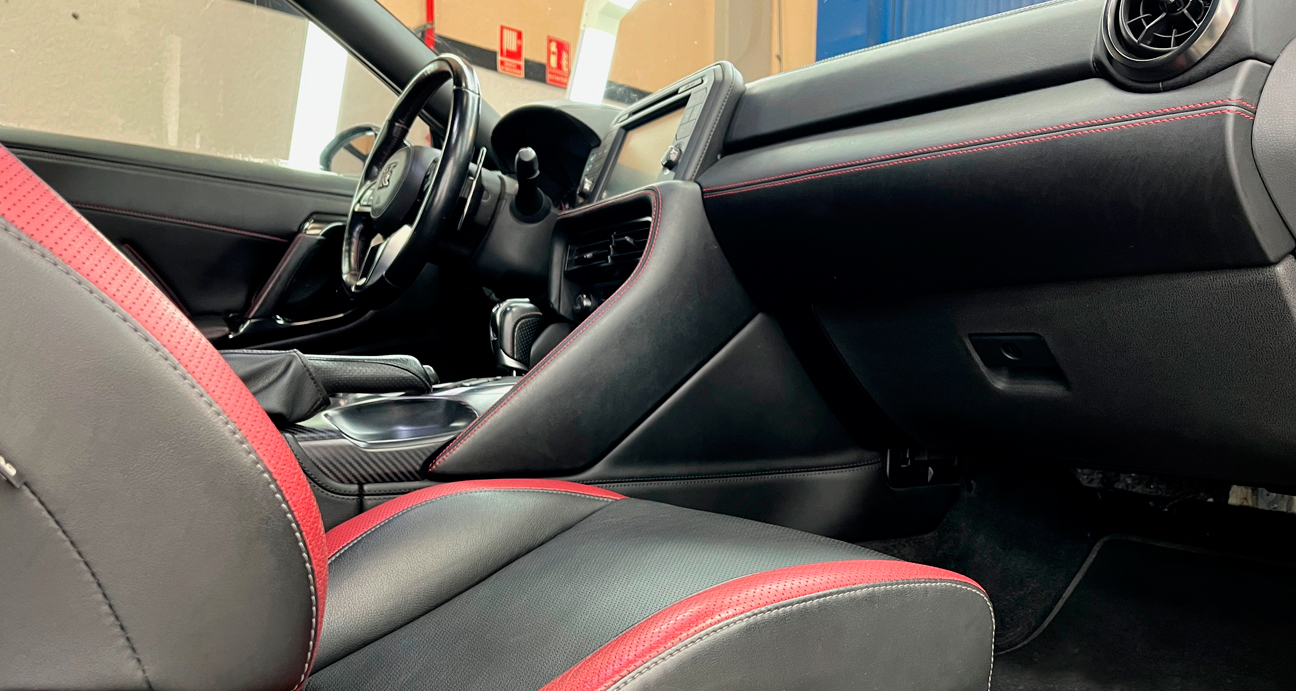 Couleur intérieure : Sellerie semi-cuir / alcantara noire avec surpiqures rouges.